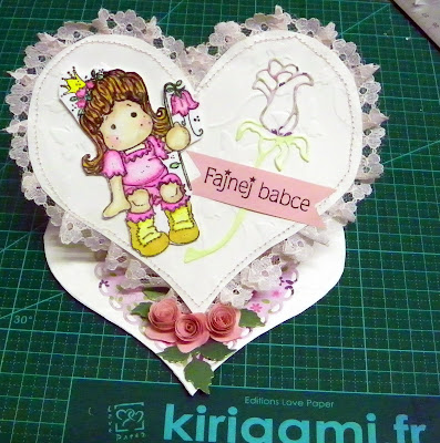 Stempelek ciągle jeszcze z zasobów kolorowanych kredkami akwarelowymi.Nie pytajcie o nazwę,bo ja głowy do nich nie mam. Ja nie wiem jak wy zapamiętujecie nazwy wszystkich pieczątek ,papierków i inszych przydasi a jeszcze na dokładkę to gdzie zostały kupione. Wracając do karteczki, to jak widać przyszyłam do niej bladoróżową koronkę, dodalam trochę wycinanek i perełki. Ot takie małe co nieco...